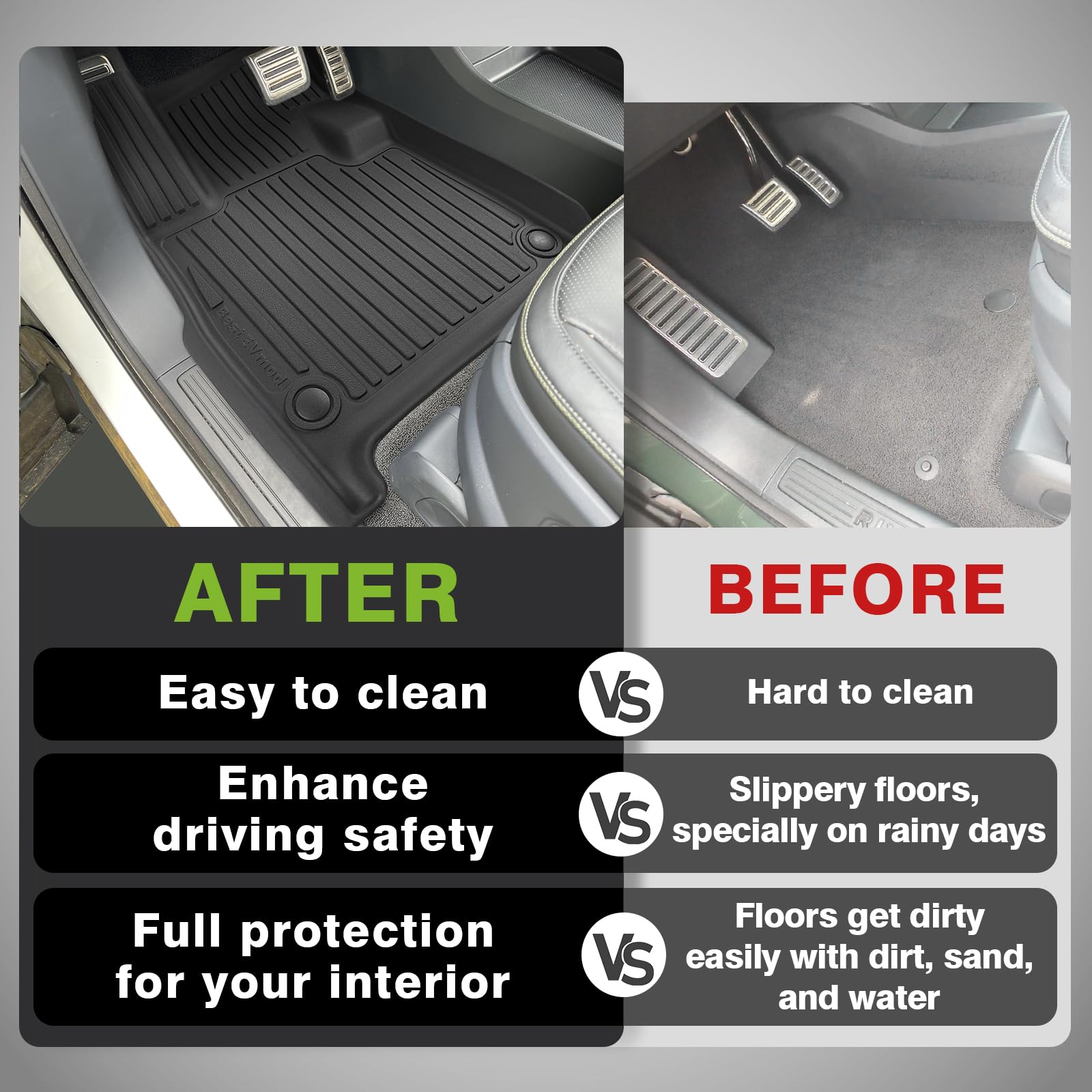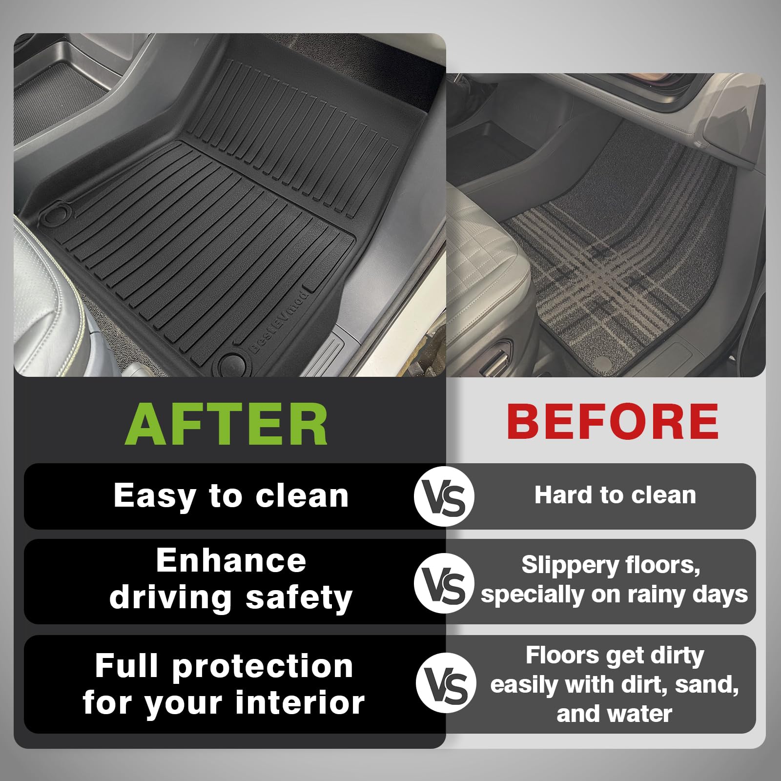 - Function: This mat is being used at third row up position. Protect your vehicle floor from scratch, dirt, stains and spills while prevent items from sliding around.