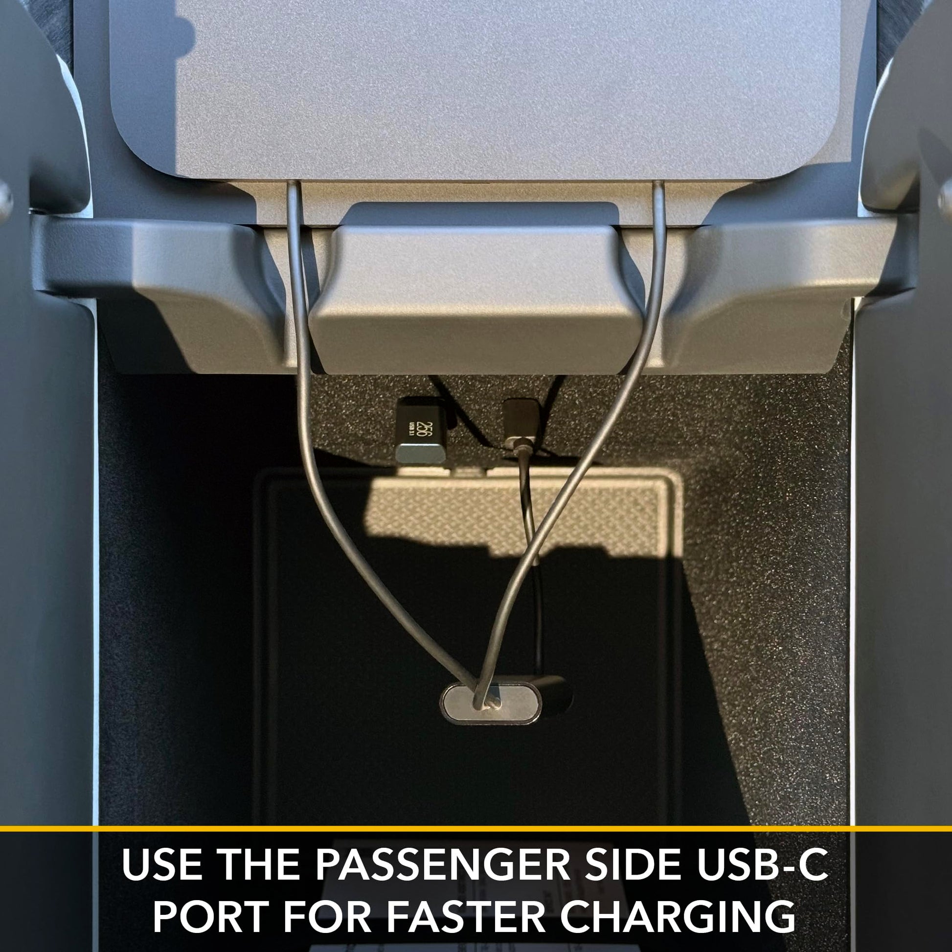 - 🔌 Single USB-C connectector: The 2 phone chargers are powered through a single USB-C cord, which leaves the second USB-C port in the armrest available for a flash for your Gear Guard Camera.